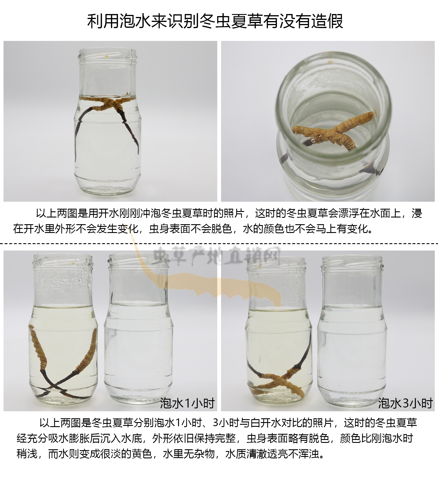 通過觀察上面的冬蟲夏草泡水圖片,我們從反向推理,可得出以下6個關(guān)于識別真假冬蟲夏草的結(jié)論: